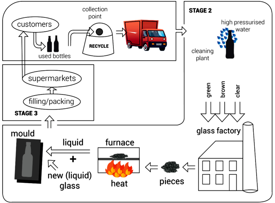 At the first stage of the process, glass bottles are used by customers and gathered at a collection point before being delivered to a cleaning plant by a truck. The second stage begins when the bottles are washed with high-pressure water, and subsequently sorted based on their colour (green, brown and clear). After that, the bottles are broken down into pieces in a glass factory and melted in a furnace to form a liquid. The recycled liquid glass is then mixed with new liquid glass and poured into a mould to form new glass bottles.