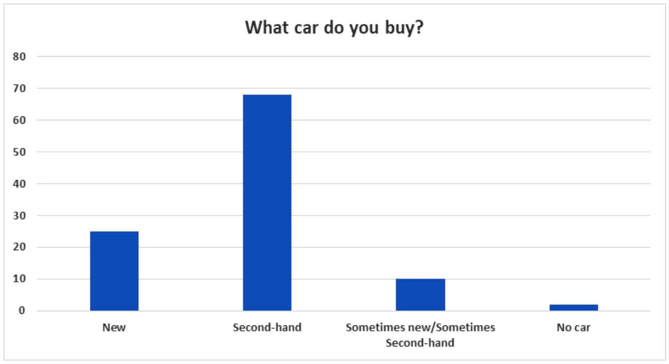 With regards to the type of vehicle purchased, approximately 68% of people chose to buy second-hand cars, while about 25% bought brand new vehicles. In addition, roughly 10% of people sometimes purchased either new or second-hand cars.