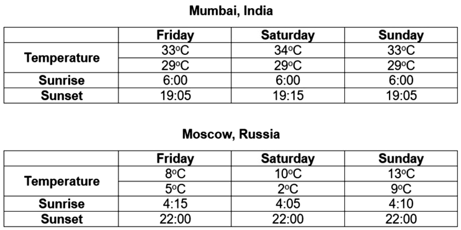 The tables compare data regarding the temperatures and daylight hours in Mumbai and Moscow, during the same week in May, 2017.