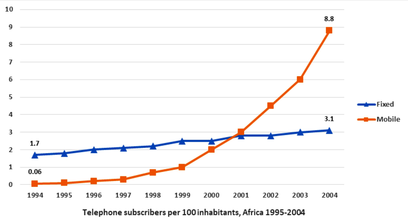 In 1994, 1.7% of African inhabitants subscribed to fixed line phones, with only 0.06% of people using mobile phones. Both types of phone subscription slowly increased over the following four years, with mobile phones increasingly gaining popularity and equaling the percentage of fixed line users in the year 2000, at approximately 2.5%.