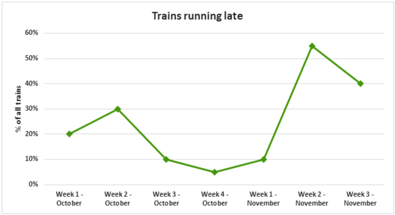 In the first week of October, about 20% of all trains did not run on time. This figure then rose slightly in the next week before dropping to about 5% in the last week of October. In contrast, approximately half of all trains were late during the second week in November, followed by a slight drop to 40% in the third week.