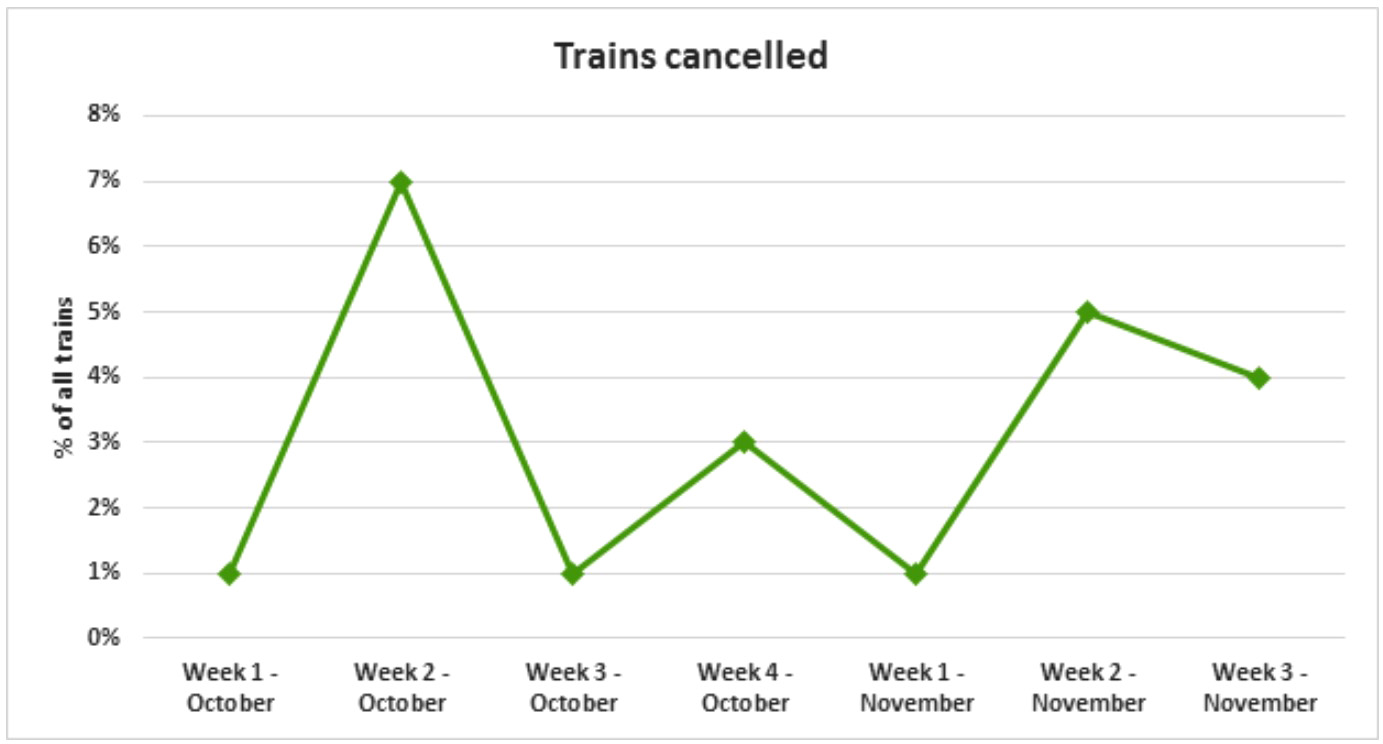 It is clear that the percentage of trains that were delayed or cancelled both witnessed significant fluctuations over the period shown. Additionally, while the highest percentage of train trips were cancelled in October, the highest percentage of trains that were late occurred in November.