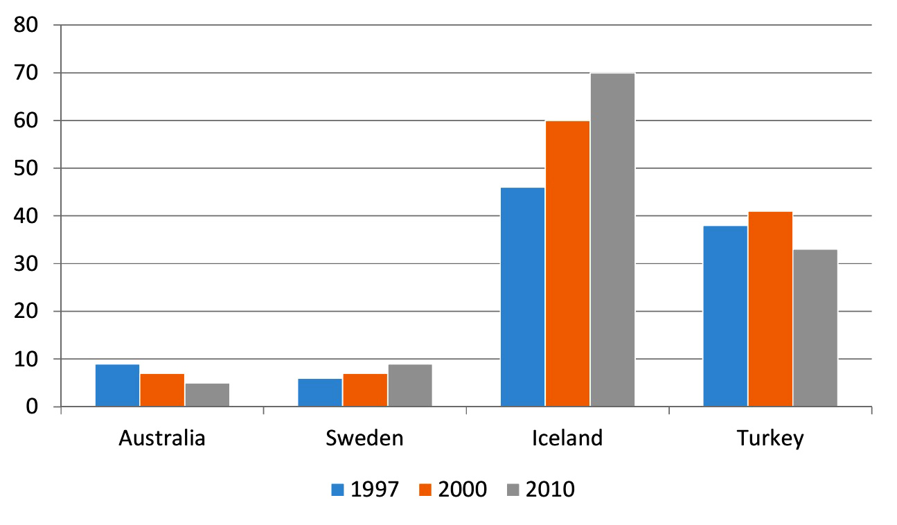 In 1997, almost half of the total energy produced in Iceland came from renewable resources. This figure continued to climb steadily to 60% in 2000 and more than 70% in 2010. Meanwhile, in 1997, only approximately 5% of the entire amount of energy produced was generated from natural resources in Sweden, who experienced a similar trend to that of Iceland in regards to proportion of renewable energy produced.