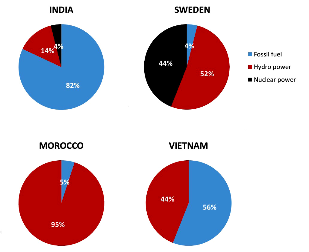 In Vietnam, 56% of the total amount of electricity was produced from fossil fuels, while the figure for Morocco was only 5%. The rest of the electricity, in both nations, was produced solely from hydro power.