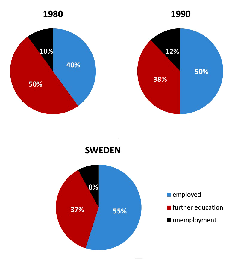 In 1980, half of the Australian secondary school leavers chose to continue their education. After a 10- year period, this number dropped to only 38% and remained almost unchanged in 2000. Meanwhile, the figures for those who were unemployment were the smallest, at only 10% in 1980, 12% in 1990, and finally dropping back down to 8% in 2000.