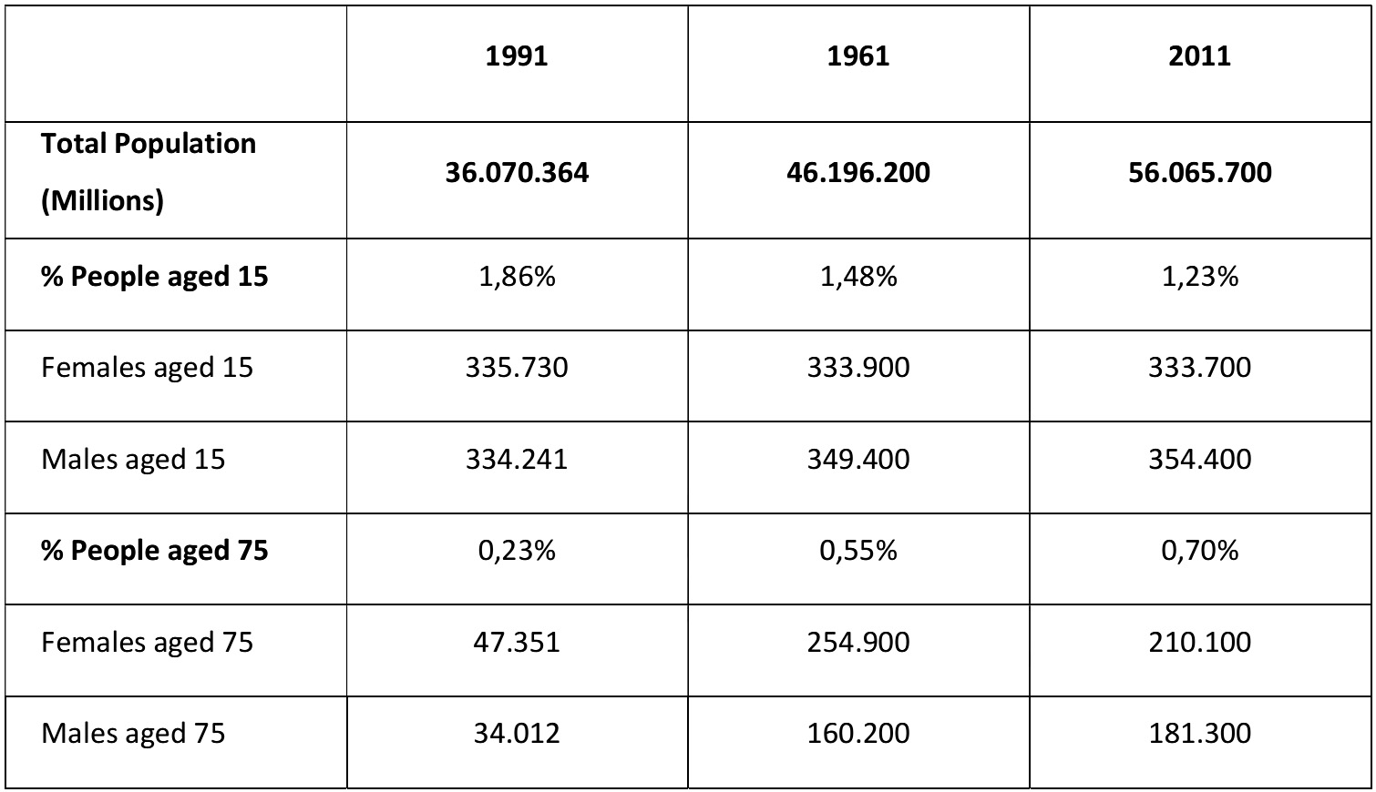 The table gives information about the percentages of males and females at the age of 15 and 75 in the UK during the years 1911, 1961 and 2011.