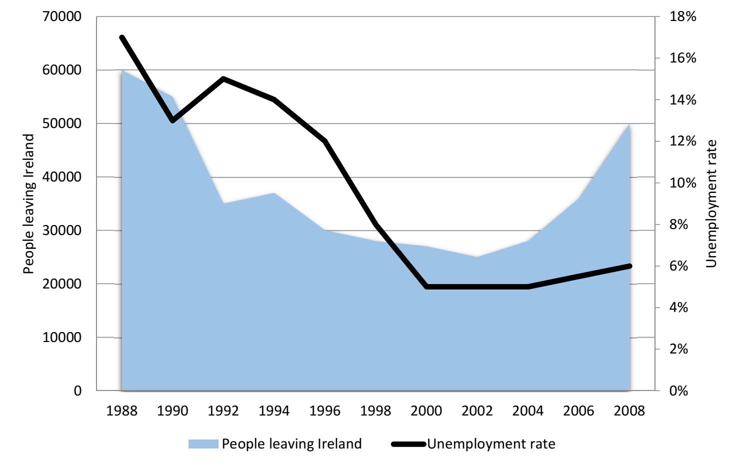 The chart below gives information about the percentage of unemployed Irish citizens and the number of emigrants leaving the country from 1988 to 2008.