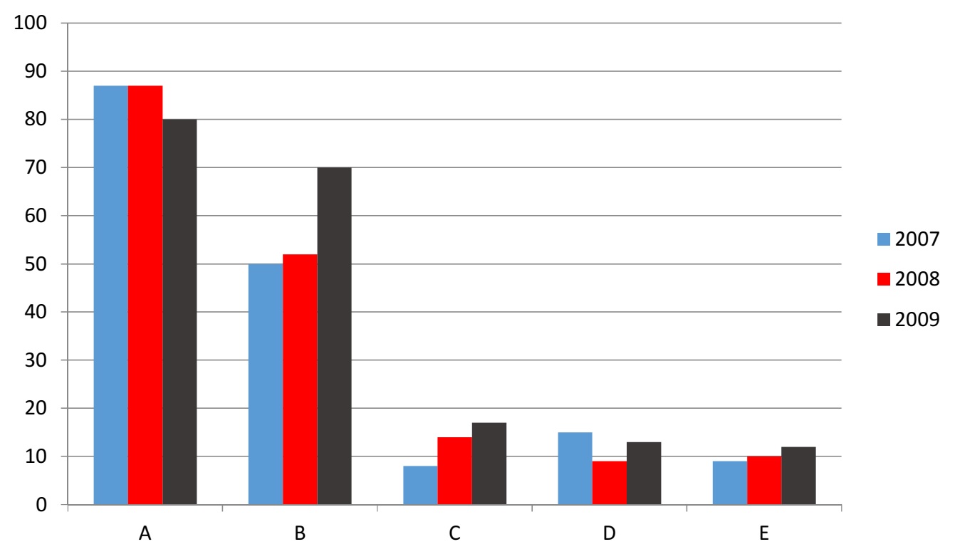 The bar chart provides information about movie production in five different countries (labelled A-E) from 2007 to 2009.