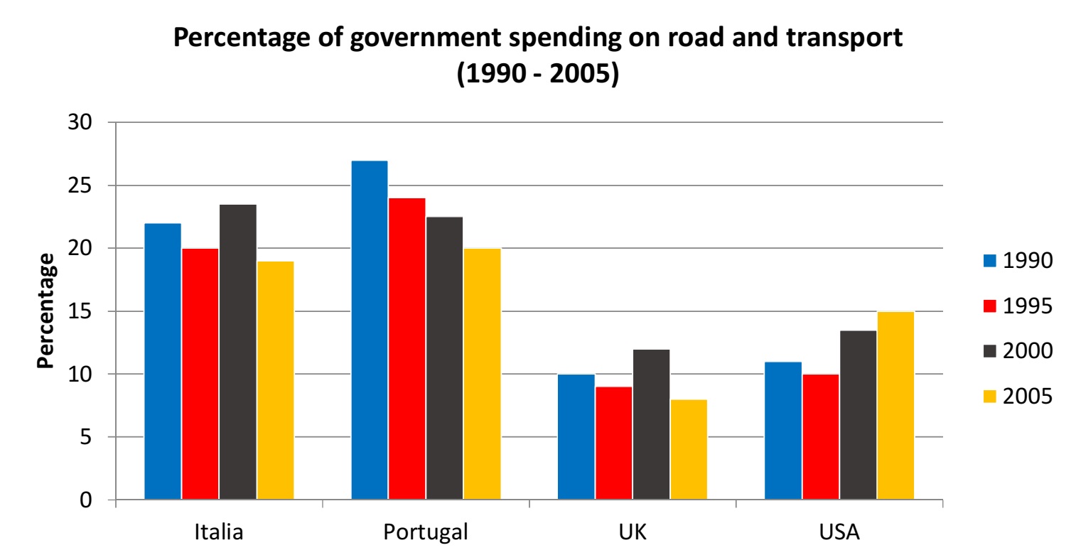 By 2000 while Portugal continued to reduce its road and transport spending down to around 22%, Italy had increased its spending to approximately 23%, overtaking Portugal as the leading spender on transport infrastructure in 2000. The UK and USA had both increased spending in 2000 by about 3%. In 2005, all countries except USA further reduced their spending with Portugal, Italy, UK and the USA at 20%, 19%, 8% and 15% respectively.