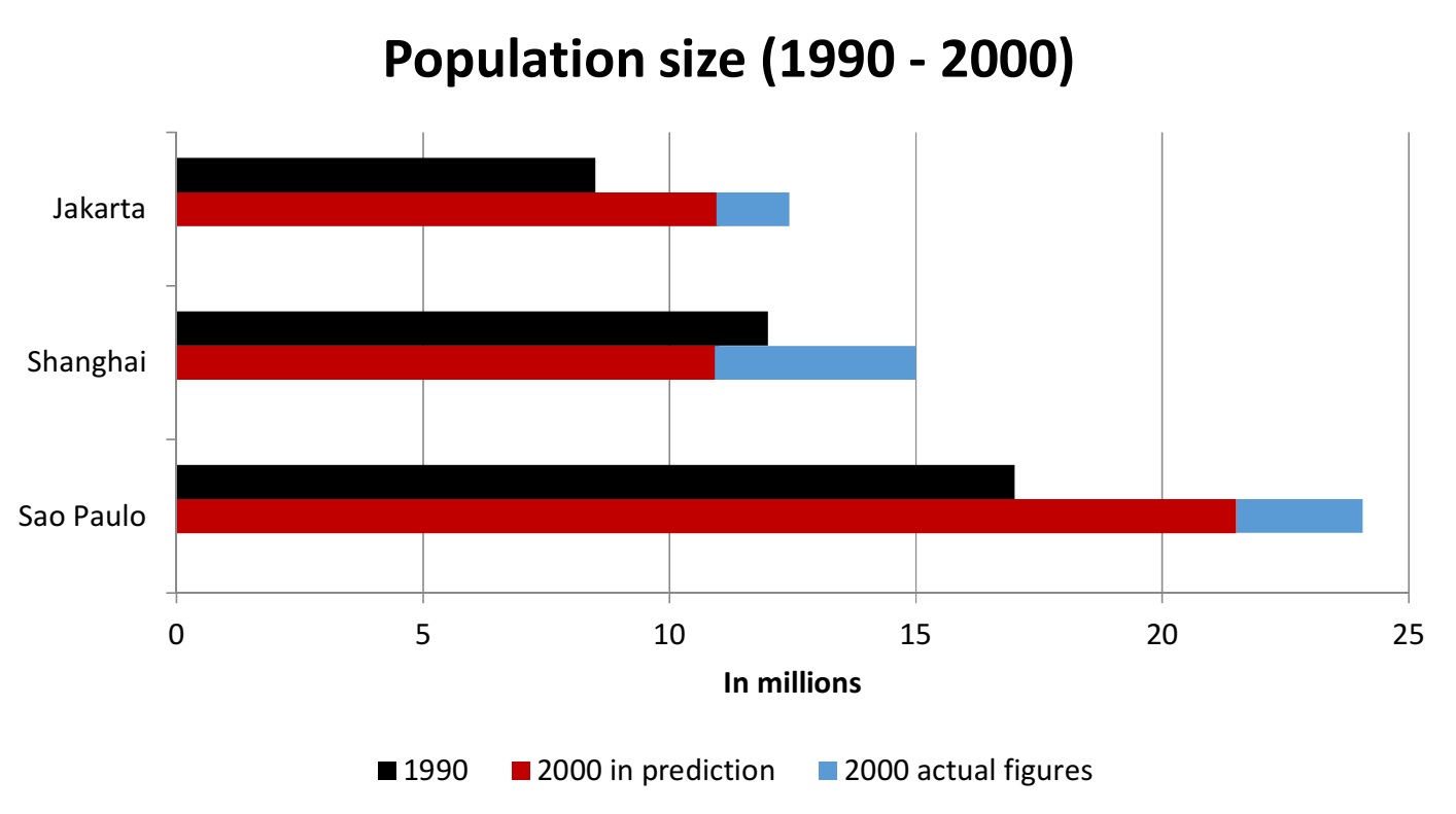 Overall, the population figures were highest for Sao Paulo, while Jakarta had the lowest number of inhabitants. Also, there were significant differences in the predicted and actual figures for 2000 in all countries.