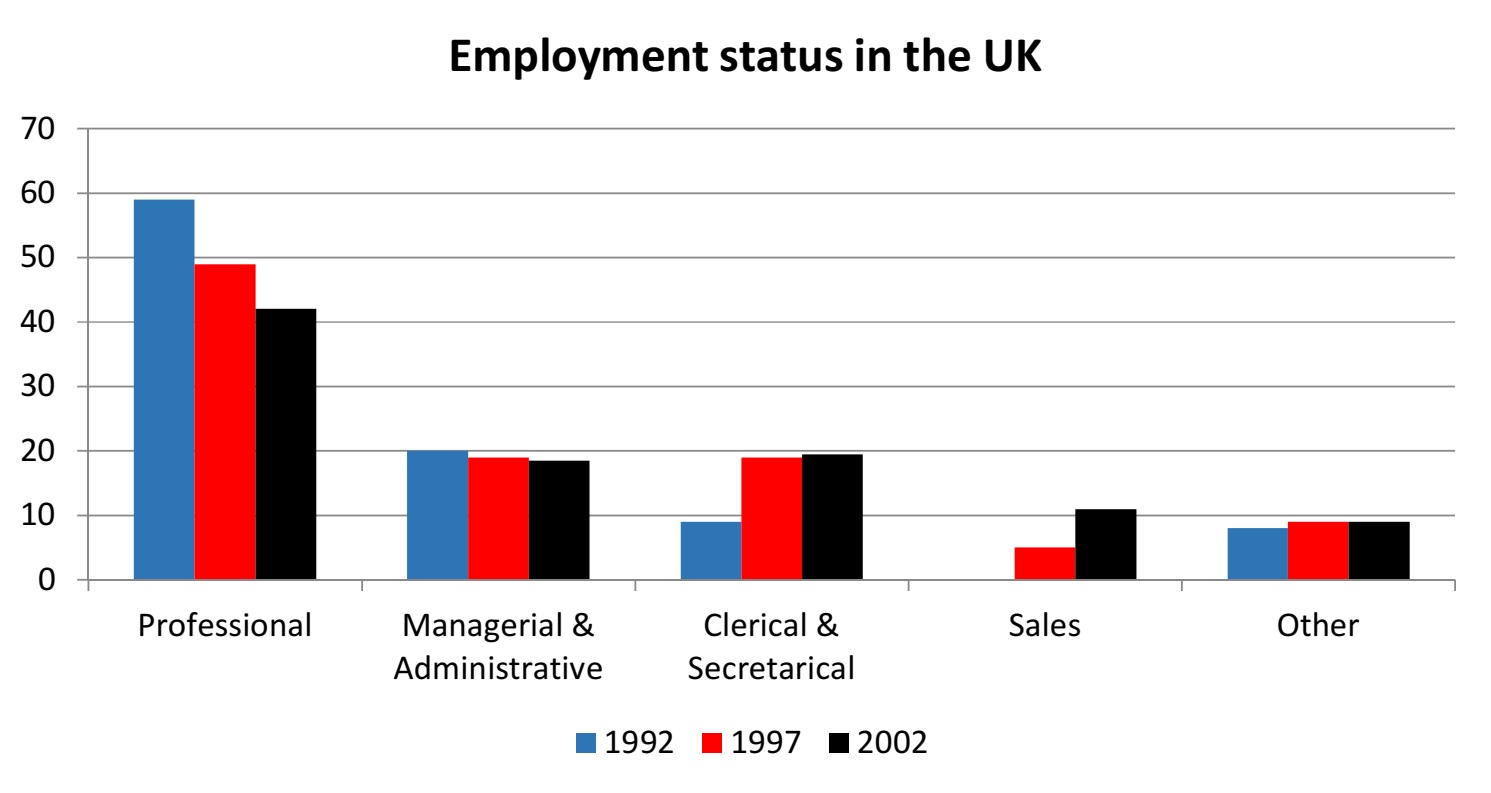 As far as their employment status was concerned, careers in clerical and secretarial fields saw a marginal rise from 9% in 1992 to nearly 20% in 2002. An opposite trend is seen in jobs related to management and administration, with the figures standing at 20% in 1992 and dropping by 1% 10 years later. Similarly, the figure for professional careers also showed a downward trend, although much steeper, from a peak of nearly 60% to its low of around 44%.