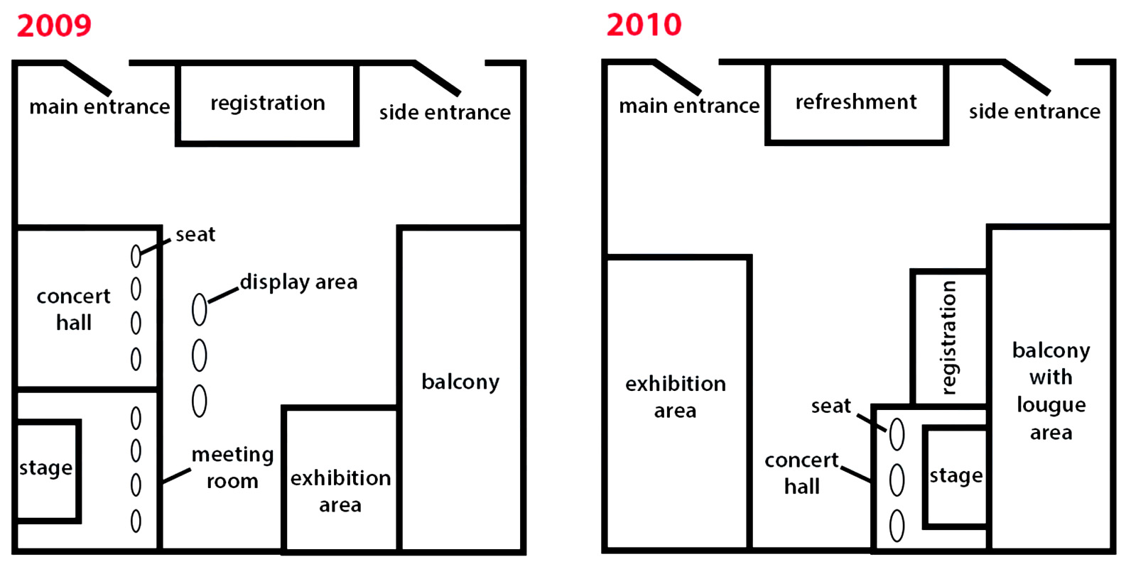 Overall, the most striking difference in the layout is that the concert hall and meeting room were both replaced with a new exhibition area. Additionally, while there was a display area in 2009, it was removed the following year.