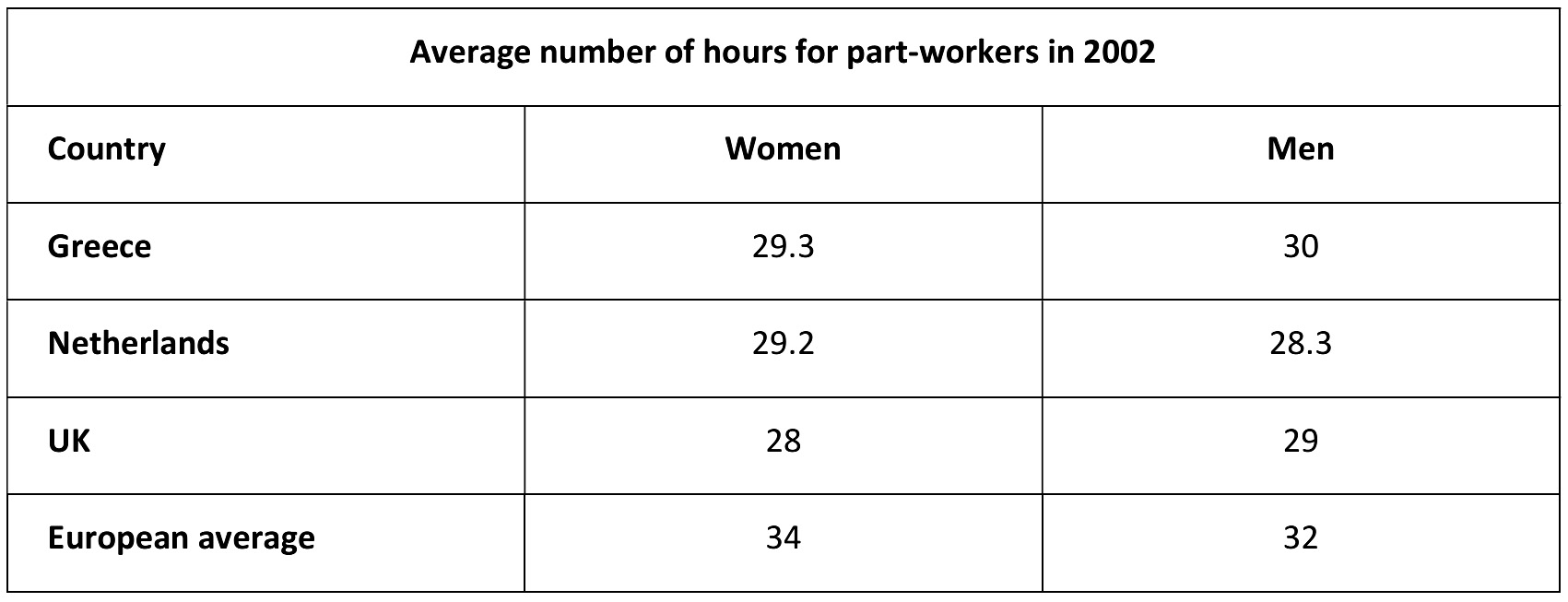 Regarding the figures for part-time workers, it is noticeable that those from Greece still held the highest position in the list with 29.3 hours for women and 30 hours for men. Similarly, UK males also had more part-time hours, at 29, compared to 28 hours for females. Conversely, a reverse trend can be seen in the numbers of men and women in Netherlands, with 28.3 hours for the former and 29.2 hours for the latter.