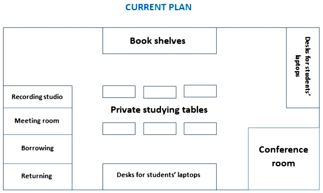 In the center of the library, more private studying tables have been set up for students to study. Additionally, there were two areas for book shelves in the north and south of the library five years ago; however, the one in the south as well as the desk for computers on the eastern side of the room has been converted into desks for student’s laptops. Next to this it can be seen that the library office has been removed to make way for a new conference room.