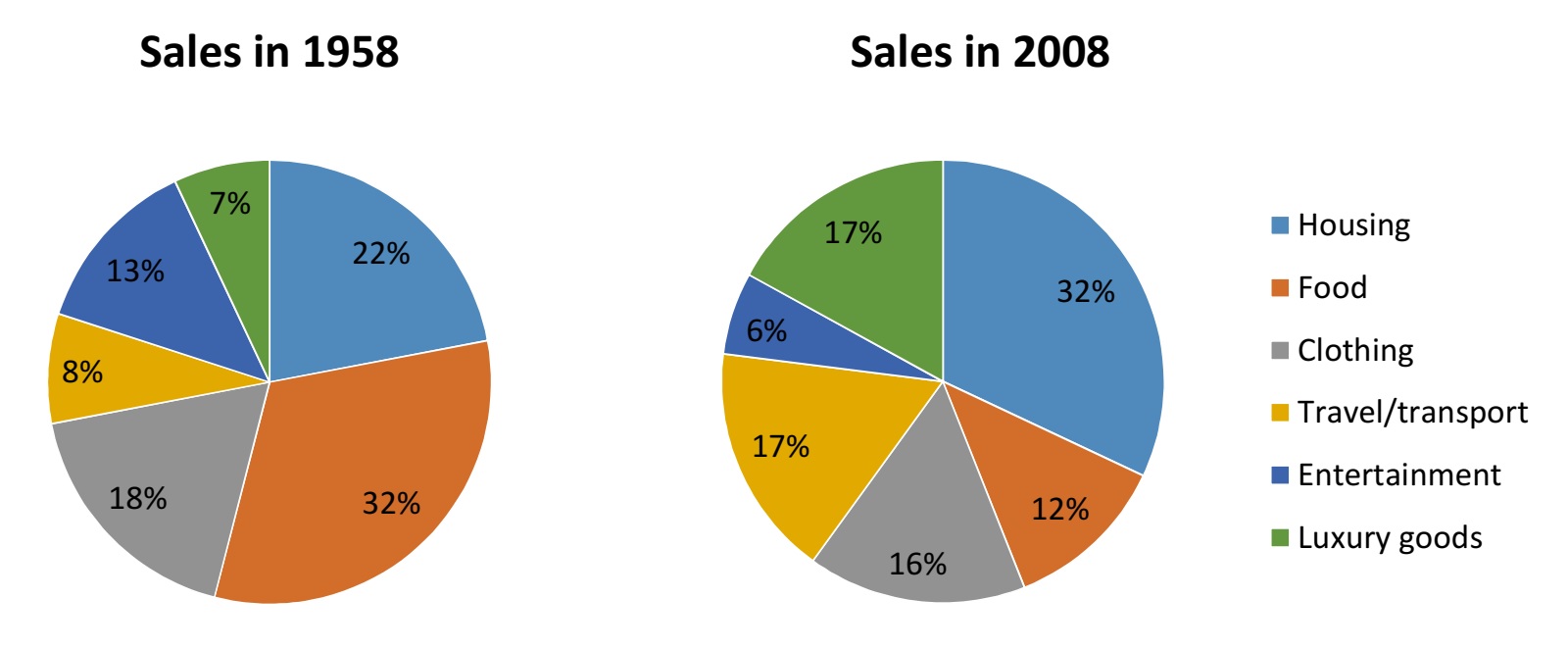 The pie charts detail the proportion of people’s total expenditure on six different goods and services (housing, clothing, entertainment, food, travel/transport, and luxury goods), in a European country, in 1958 and 2008.