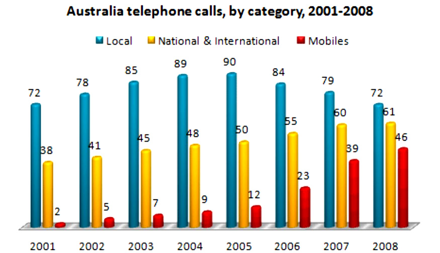 The barchart below shows the total number of minutes (in billions) of telephone calls in Australia, divided into three categories, from 2001- 2008. Summarise the information by selecting and reporting the main features and make comparisons where relevant.
