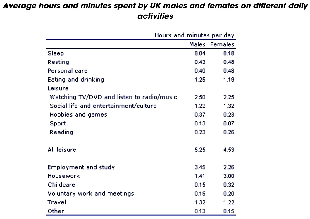 The table compares the average amount of time per day that men and women in the UK spend doing different activities.