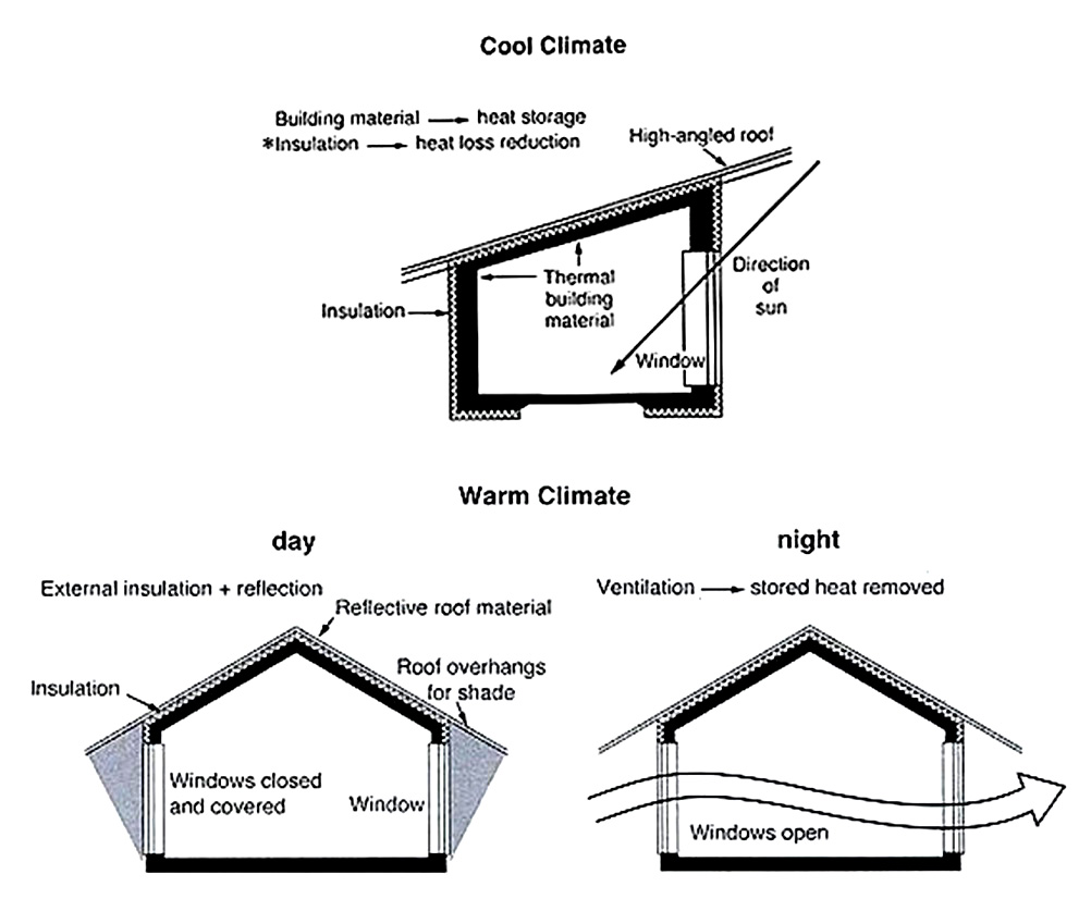 Finally, the cool climate house has one window which faces the direction of the sun, while the warm climate house has windows on two sides which are shaded from the sun. By opening the two windows at night, the house designed for warm climates can be ventilated.